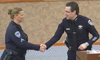 Evidence Technician Sandra Perea (here with Chief Purvis) commuted 125 miles daily at taxpayers expense